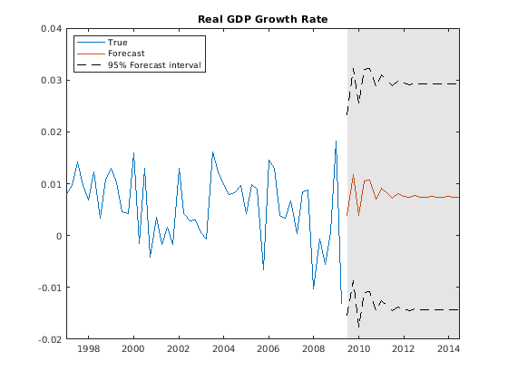 figure; h1 = plot(DataTable.Time((end-49):end),Y((end-49):end,1)); hold on; h2 = plot(FDates,Forecast(:,1)); h3 = plot(FDates,ForecastFI(:,1,1),'k--'); plot(FDates,ForecastFI(:,1,2),'k--'); title('Real GDP Growth Rate'); h = gca; fill([FDates(1) h.XLim([2 2]) FDates(1)],h.YLim([1 1 2 2]),'k',... 'FaceAlpha',0.1,'EdgeColor','none'); legend([h1 h2 h3],'True','Forecast','95% Forecast interval',... 'Location','northwest') hold off;