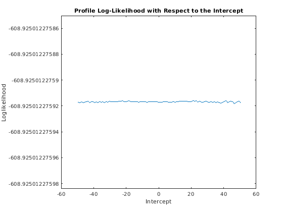 c = linspace(Mdl.Intercept - 50,... Mdl.Intercept + 50,100); % Grid of intercepts logL = nan(numel(c),1); % For preallocation for i = 1:numel(logL) EstMdl.Intercept = c(i); [~,~,~,logL(i)] = infer(EstMdl,y); end figure plot(c,logL) title('Profile Log-Likelihood with Respect to the Intercept') xlabel('Intercept') ylabel('Loglikelihood')