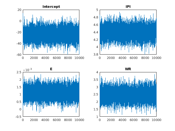 figure; for j = 1:(p + 1) subplot(2,2,j); plot(PosteriorMdl.BetaDraws(j,:)); title(sprintf('%s',PosteriorMdl.VarNames{j})); end
