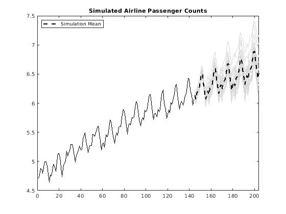 rng('default') Ysim = simulate(EstMdl,60,'NumPaths',25,'Y0',y,'E0',res); mn = mean(Ysim,2); figure plot(y,'k') hold on plot(T+1:T+60,Ysim,'Color',[.85,.85,.85]); h = plot(T+1:T+60,mn,'k--','LineWidth',2); xlim([0,T+60]) title('Simulated Airline Passenger Counts') legend(h,'Simulation Mean','Location','NorthWest') hold off