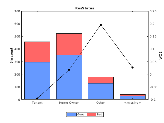 Для 'CustAge' и предикторов 'ResStatus', там пропускает данные (NaN s и <undefined>) в данных тренировки, и процесс раскладывания оценивает значение WOE -0.15787 и 0.026469 соответственно для недостающих данных в этих предикторах, как показано выше.