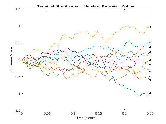 plot(sampleTimes, X), hold('on') xlabel('Time (Years)'), ylabel('Brownian State') title('Terminal Stratification: Standard Brownian Motion') plot(T, WT, '. black', T, WT, 'o black') hold('off')