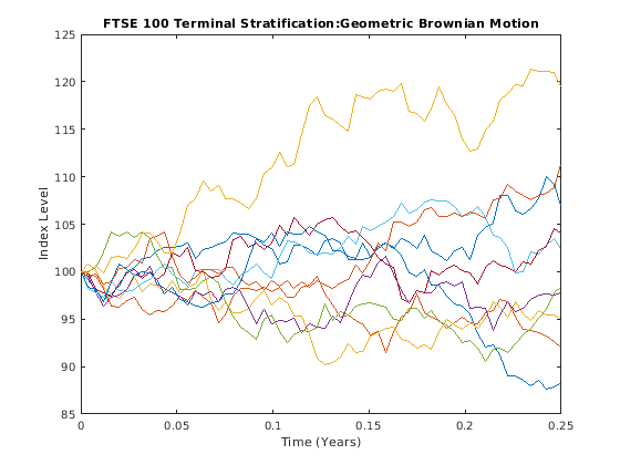 nSteps = 1; sampleTimes = cumsum([obj.StartTime ; ... dt(ones(nPeriods * nSteps,1))/nSteps]); z = Example_StratifiedRNG(nPaths, sampleTimes); rng(10203,'twister') [Y, Times] = obj.simBySolution(nPeriods, 'nTrials', nPaths,... 'DeltaTime', dt, 'nSteps', nSteps, 'Z', z); Y = squeeze(Y); % Reorder to a 2-D array plot(Times, Y) xlabel('Time (Years)'), ylabel('Index Level') title('FTSE 100 Terminal Stratification:Geometric Brownian Motion')