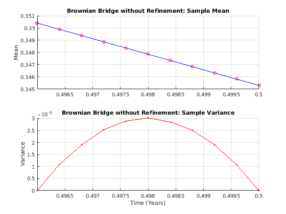 subplot(2,1,1); hold on; grid on; plot([T(n) T(n + 1)],[X(n,1) X(n + 1,1)],'.-b') plot(times, average, 'or') hold off; title('Brownian Bridge without Refinement: Sample Mean') ylabel('Mean') limits = axis; axis([T(n) T(n + 1) limits(3:4)]); subplot(2,1,2) hold on; grid on; plot(T(n),0,'.-b',T(n + 1),0,'.-b') plot(times, variance, '.-r') hold('off'); title('Brownian Bridge without Refinement: Sample Variance') xlabel('Time (Years)') ylabel('Variance') limits = axis; axis([T(n) T(n + 1) limits(3:4)]);