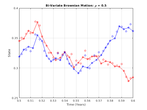plot(T,X(:,1),'.-r',T,X(:,2),'.-b') grid on; hold on; plot(t,x(:,1),'or',t,x(:,2),'ob') hold off; xlabel('Time (Years)') ylabel('State') title('Bi-Variate Brownian Motion: \rho = 0.5') axis([0.4999 0.6001 0.25 0.4])