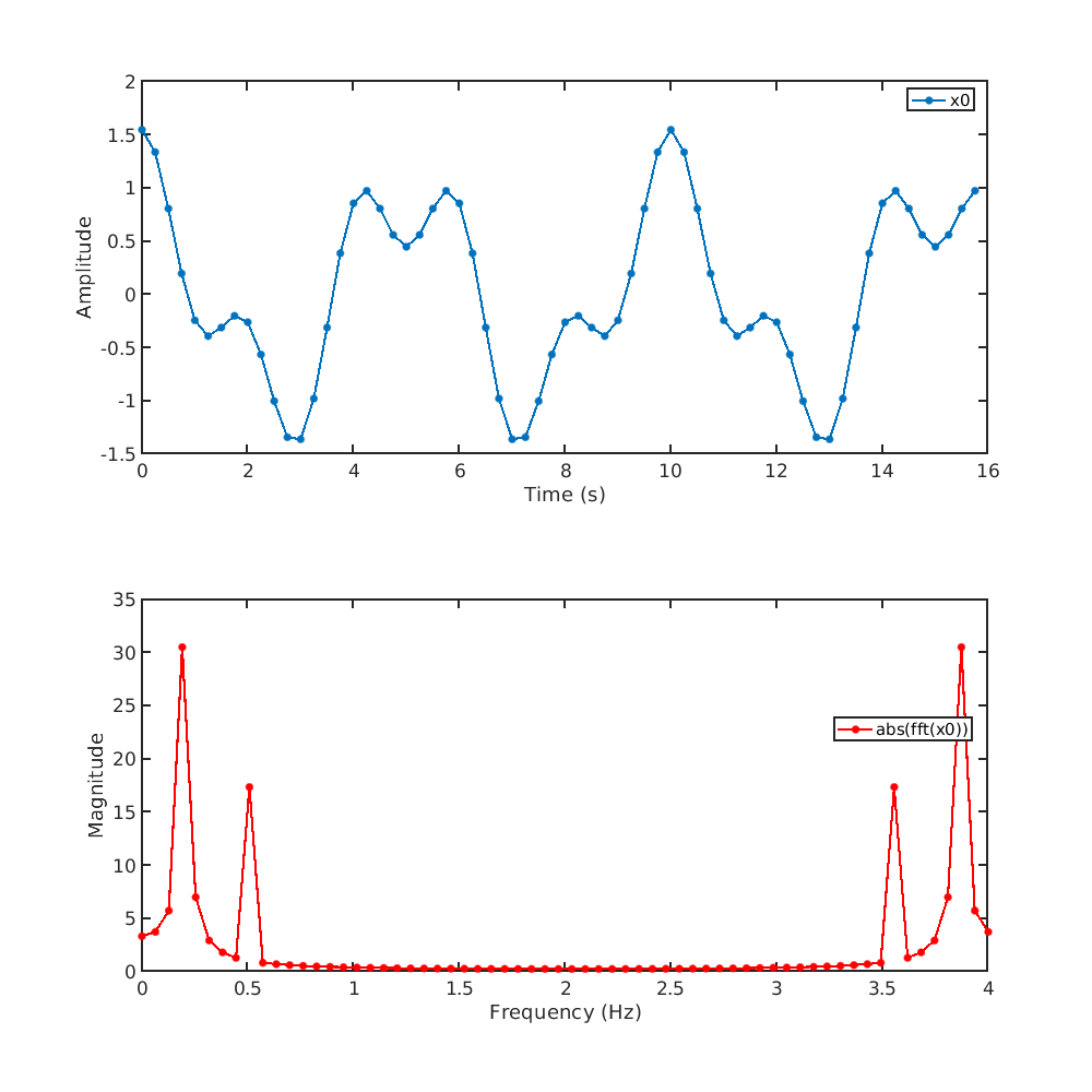 n = 64; % Number of points Fs = 4; % Sampling frequency in Hz t = (0:(n-1))/Fs; % Time vector f = linspace(0,Fs,n); % Frequency vector f0 = .2; f1 = .5; % Frequencies, in Hz x0 = cos(2*pi*f0*t) + 0.55*cos(2*pi*f1*t); % Time-domain signal x0 = complex(x0); % The textbook algorithm requires % the input to be complex y0 = fft(x0); % Frequency-domain transformation % fft() is a MATLAB built-in % function fidemo.fi_fft_demo_ini_plot(t,x0,f,y0); % Plotting the results from fft % and time-domain signal