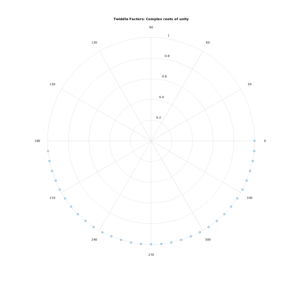 figure(gcf) clf w0 = fidemo.fi_radix2twiddles(n); polar(angle(w0),abs(w0),'o') title('Twiddle Factors: Complex roots of unity')