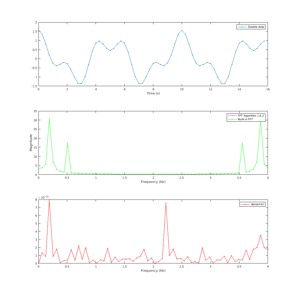 y = fi_m_radix2fft_algorithm1_6_2(x0, w0); fidemo.fi_fft_demo_plot(real(x0),y,y0,Fs,'Double data', ... {'FFT Algorithm 1.6.2','Built-in FFT'});