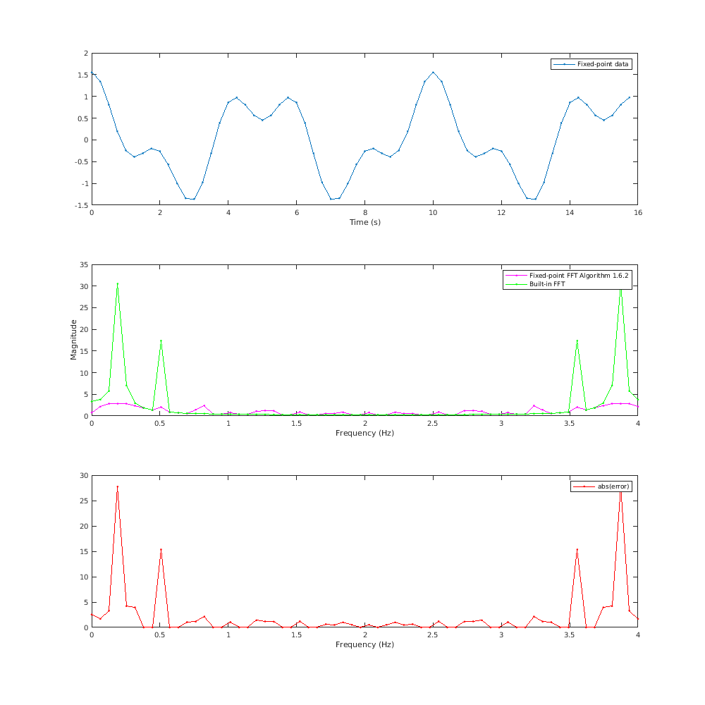 y = fi_m_radix2fft_algorithm1_6_2_typed(x,w,T2); fidemo.fi_fft_demo_plot(real(x),y,y0,Fs,'Fixed-point data', ... {'Fixed-point FFT Algorithm 1.6.2','Built-in FFT'});