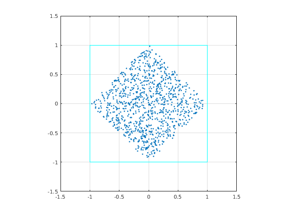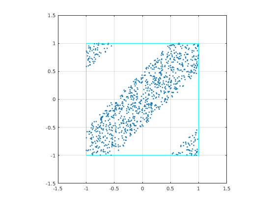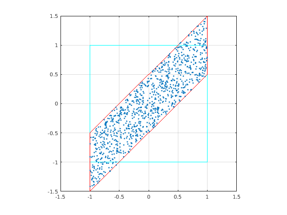 clf r = 2*rand(2,1000)-1; pr = A2*r; plot([-1 1 1 -1 -1],[-1 -1 1 1 -1],'c') axis([-1.5 1.5 -1.5 1.5]); axis square; grid; hold on plot(pr(1,:),pr(2,:),'.')