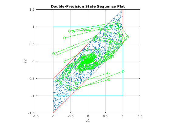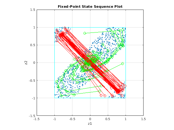x = fi(zeros(10,1),1,16,15,'fimath',F); zi = fi([0;0],1,16,15,'fimath',F); q = assignmentquantizer(zi); e = double(eps(zi)); rng('default'); for k=1:20 y = x; zi(:) = randquant(q,size(A,1),1); [y,zf] = fidemo.fisisostatespacefilter(A,B,C,D,x,zi); if abs(double(zf(end)))>0.5, c='ro-'; else, c='go-'; end plot(zf(1,:), zf(2,:),c,'markersize',8); end title('Fixed-Point State Sequence Plot'); xlabel('z1'); ylabel('z2')
