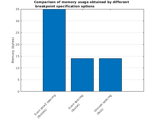 memoryValues = [... totalMemoryUsage(bestEvenPow2SpacingSolution), ... totalMemoryUsage(bestEvenSpacingSolution), ... totalMemoryUsage(bestUnevenSpacingSolution)]; figure(); xTickLabels = {'Even pow2 spacing \newline(fastest)','Even spacing \newline(faster)','Uneven spacing \newline(fast)'}; hMemory = bar(memoryValues); title('Comparison of memory usage obtained by different \newline breakpoint specification options'); hMemory.Parent.XTickLabel = xTickLabels; hMemory.Parent.XTickLabelRotation = 45; hMemory.Parent.YLabel.String = 'Memory (bytes)'; hMemory.Parent.Box = 'on'; hMemory.Parent.YGrid = 'on';