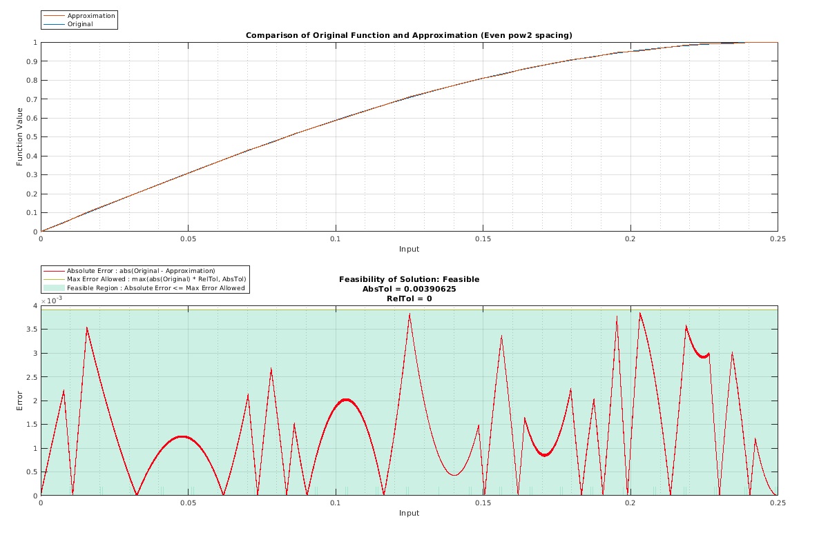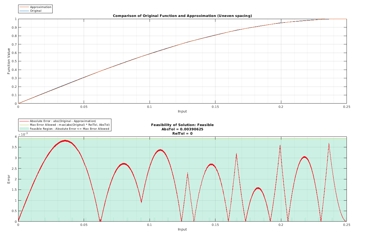 %The software returns several implementations that meet the requirements %specified in the |FunctionApproximation.Problem| and %|FunctionApproximation.Options| objects. You can explore these different %implementations. feasibleSolutions = solution.FeasibleSolutions; tableDataVec = [feasibleSolutions.TableData]; evenSpacingSolutions = find([tableDataVec.IsEvenSpacing]); unevenSpacingSolutions = find(~[tableDataVec.IsEvenSpacing]); evenSolutionsMemoryUsage = arrayfun(@(x) x.totalMemoryUsage(), feasibleSolutions(evenSpacingSolutions)); unevenSolutionsMemoryUsage = arrayfun(@(x) x.totalMemoryUsage(), feasibleSolutions(unevenSpacingSolutions)); bestEvenSpacingSolution = feasibleSolutions(evenSpacingSolutions(evenSolutionsMemoryUsage == min(evenSolutionsMemoryUsage))); bestUnevenSpacingSolution = feasibleSolutions(unevenSpacingSolutions(unevenSolutionsMemoryUsage == min(unevenSolutionsMemoryUsage))); xeven = bestEvenSpacingSolution.TableData.BreakpointValues{1}; yeven = bestEvenSpacingSolution.TableData.TableValues; xuneven = bestUnevenSpacingSolution.TableData.BreakpointValues{1}; yuneven = bestUnevenSpacingSolution.TableData.TableValues; xpow2 = bestEvenPow2SpacingSolution.TableData.BreakpointValues{1}; ypow2 = bestEvenPow2SpacingSolution.TableData.TableValues;