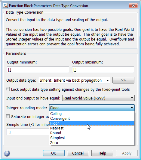 Блоки Fixed-point Simulink® поддерживают округляющиеся режимы, показанные в расширенном выпадающем меню следующего диалогового окна.