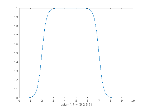 y = dsigmf(x,params) возвращает вычисленное использование значений нечеткого членства различия между двумя сигмовидными функциями принадлежности. Каждой сигмовидной функцией дают:y = dsigmf(x,params)