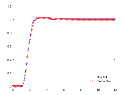 load fuzzyPID.mat plot(tout,y,'b-',rt_tout,rt_y,'ro') legend('Simulink','Executable','Location','Southeast')