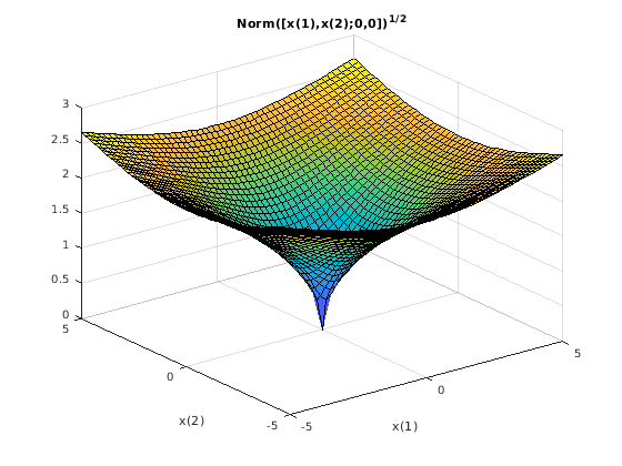figure x = linspace(-5,5,51); [xx,yy] = meshgrid(x); zz = zeros(size(xx)); for ii = 1:length(x) for jj = 1:length(x) zz(ii,jj) = sqrt(norm([xx(ii,jj),yy(ii,jj);0,0])); end end surf(xx,yy,zz) xlabel('x(1)') ylabel('x(2)') title('Norm([x(1),x(2);0,0])^{1/2}')
