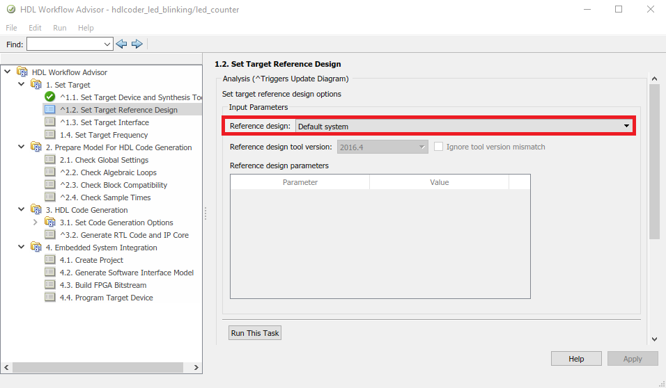 1.1. Откройте HDL Workflow Advisor от подсистемы hdlcoder_led_blinking/led_counter путем щелчка правой кнопкой по подсистеме led_counter и выбора HDL Code> HDL Workflow Advisor.