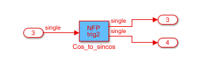 HDL Coder™ распознал шаблон моделирования и заменил блок Sin и блок Cos блоком Sincos. Этот метод оптимизации значительно улучшает производительность вашего проекта на целевой платформе.