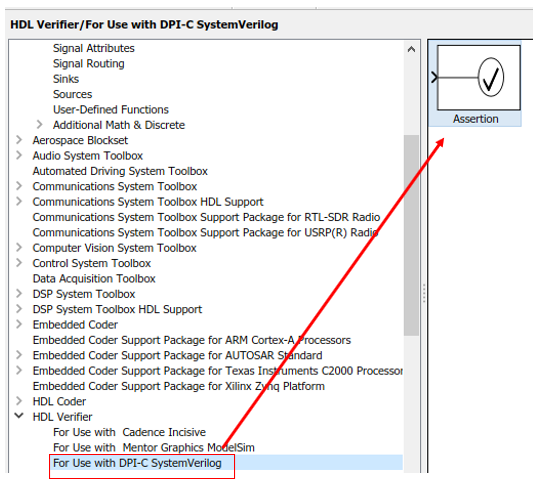 Чтобы сгенерировать компонент DPI-C, который содержит утверждения SystemVerilog, модель Simulink должна использовать блок Assertion for DPI-C. Найдите этот блок в HDL Verifier-> Для Использования с библиотекой DPI-C SystemVerilog как показано ниже: