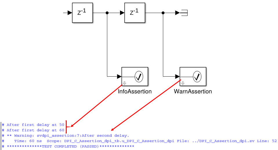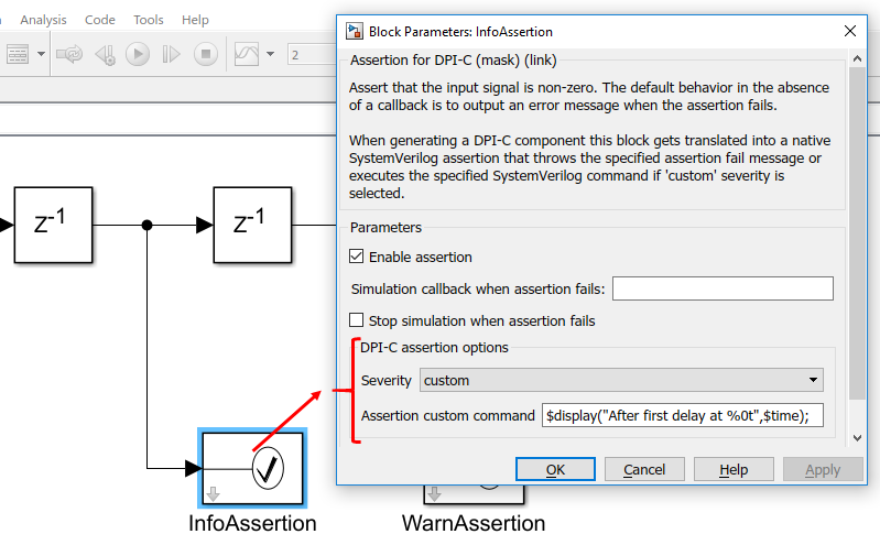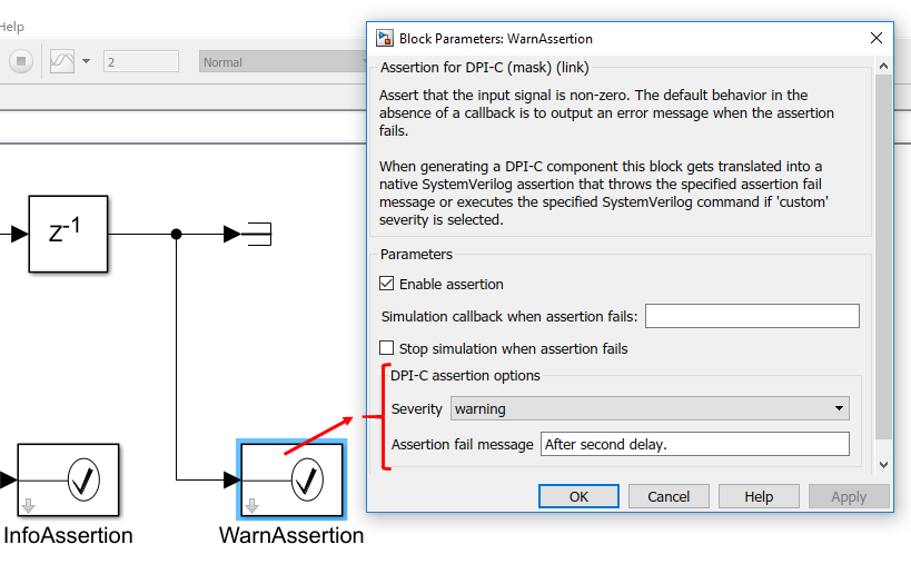 Этот блок может использоваться точно так же, как типичный блок Assertion в библиотеке Model Verification. Поведение симуляции идентично блоку Simulink Assertion, однако во время генерации компонента DPI-C, блок генерирует нативное утверждение SystemVerilog для каждого Утверждения для блока DPI-C, существующего в модели.
