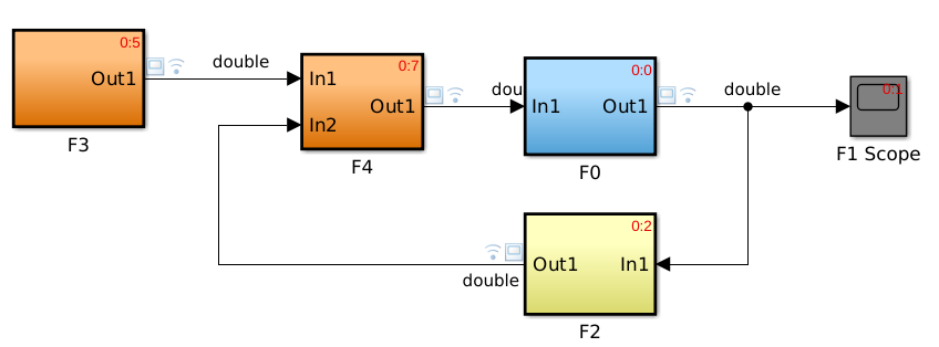В следующей модели Simulink сгенерированный код, соответствующий подсистемам, F0, F2, F3 и F4, экспортируются отдельно как модули SystemVerilog. По умолчанию каждый модуль содержит три управляющих сигнала: синхронизируйте, часы включают и сбрасывают. В симуляции HDL обновление подсистемы и выходные функции будут названы на сигнале фронта. Планировщик события инициировал бы, те обновляют и выходная функция в симуляторе HDL в той же последовательности как в модели Simulink.