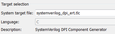 Выберите Code Generation-> System Target File. Кликните по Кнопке обзора и выберите "systemverilog_dpi_grt.tlc".