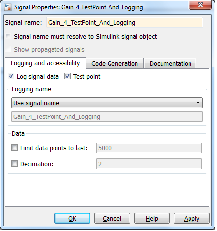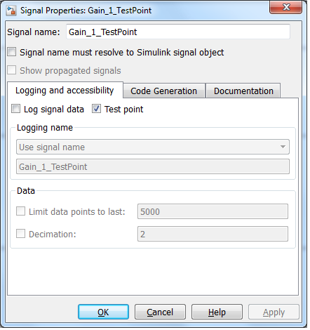 Если вы также интересуетесь получением тестового вектора внутреннего сигнала и воспроизводите его в сгенерированном испытательном стенде, затем устанавливают флажки "Test Point" и "Log Signal Data".