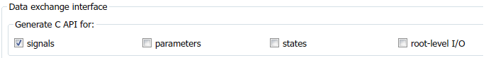 Второй шаг должен включить API C, предлагаемый Embedded Coder. Чтобы сделать это движение к панели Параметров конфигурации и на Генерации кода->, Интерфейс убеждается, что, по крайней мере, флажок "сигналов" устанавливается.