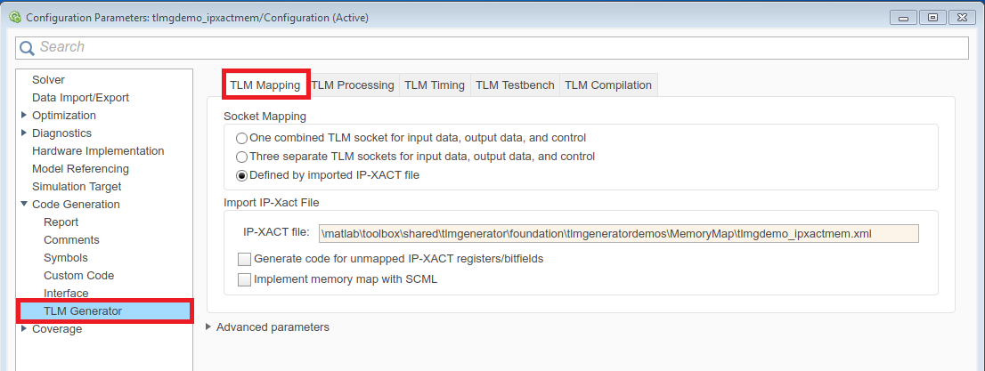 Импорт опция IP-XACT генерирует компонент TLM согласно файлу спецификации IP-XACT. В этом конкретном примере файл IP-XACT задал один сокет tlm с картой распределения памяти для входных параметров модели Simulink, один сокет tlm с картой распределения памяти для модели Simulink выходные параметры и один сокет tlm с картой распределения памяти для настраиваемых параметров. Каждый вход модели Simulink связан со своим соответствующим регистром записи в первом сокете. Каждый вывод связан со своим соответствующим регистром чтения во втором сокете tlm. Каждый настраиваемый параметр связан со своим соответствующим регистром чтения-записи в третьем сокете tlm. Когда создано с этой опцией, сгенерированный компонент TLM может использоваться в виртуальной платформе (VP) в качестве автономного компонента в испытательном стенде, или это могло быть присоединено к каналу связи.