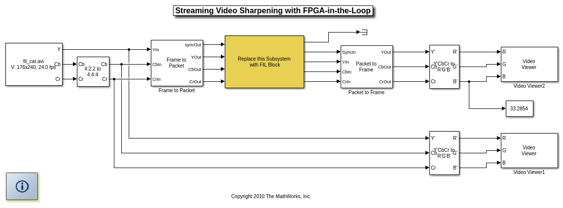 Этот пример использует FPGA в цикле (FIL) симуляция, чтобы ускорить симуляцию обработки видеоданных с Simulink® путем добавления FPGA. Показанный процесс анализирует простую систему, которая увеличивает резкость ввода видео RGB на уровне 24 кадров в секунду.