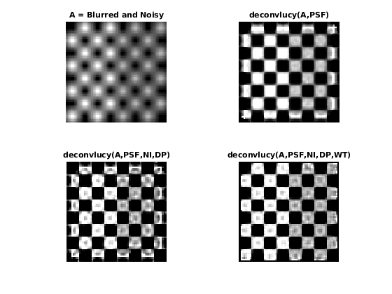 Чтобы улучшить восстановление, deconvlucy поддерживает несколько дополнительных параметров, описанных ниже. Используйте [] в качестве заполнителя, если вы не задаете промежуточный параметр.