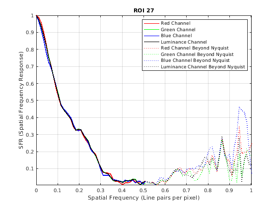 plotSFR(myTable,'ROIIndex',2) отображает измеренную резкость только ROI 2.'ROIIndex' — Индексы ROIИндексы ROI, чтобы отобразиться, заданный как пара, разделенная запятой, состоящая из 'ROIIndex' и скаляра или вектора целых чисел в области значений [1, 60]. Индексы совпадают с числами ROI, отображенными displayChart.