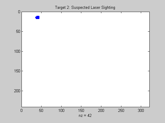 % Target 2... figure(laserFig); hTarget.XData = 0; hTarget.YData = 1; sound(1), pause(2) sound(1), trigger(vid); acqResults{2} = getdata(vid, 1); [xCalib(2), yCalib(2), laserSights] = util_findlaser(acqResults{2}); figure(spyFig); spy(laserSights) title('Target 2: Suspected Laser Sighting')