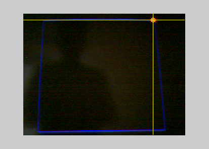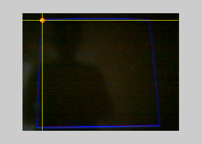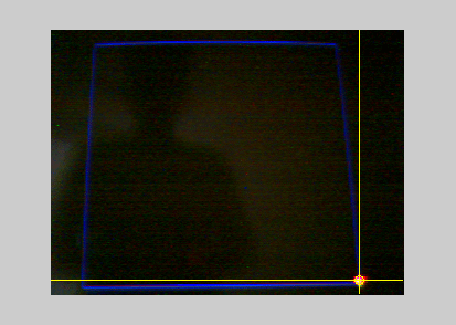 Теперь, когда камера фокусируется на правильной области, цель чертится в каждом из четырех углов поля. Калибровка выполняется, нацеливая лазер на каждом углу синего квадрата, позволяя отношению быть установленной между пиксельными координатами камеры (изображение) и координатами оси MATLAB (квадрат). Для каждой отображенной цели: