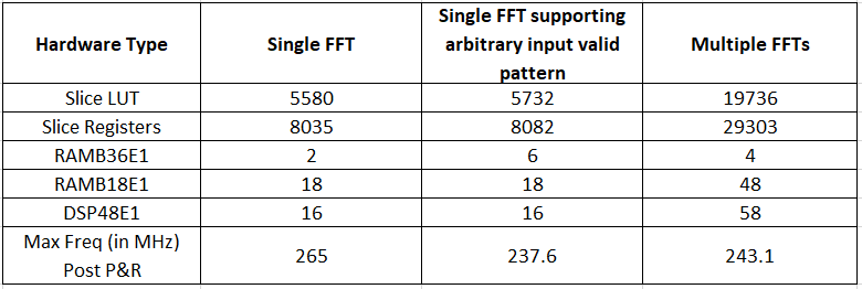 Приведенная выше таблица показывает, что реализация БПФ переменного размера с помощью одного БПФ использует гораздо меньше аппаратных ресурсов, чем использование решения для БПФ кратного. Чтобы поддержать произвольный вход допустимый шаблон, аппаратная реализация использует больше RAM.