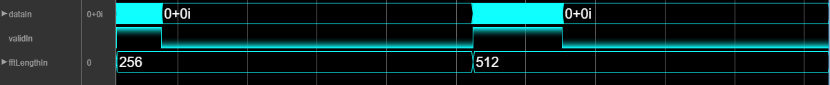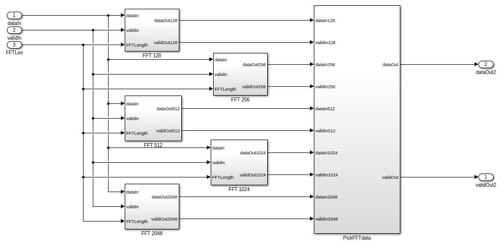 dataIn, validIn и входные параметры fftLenIn сгенерированы в MATLAB и импортированы в модель Simulink. Случайные комплексные входные данные randInputData сгенерированы для каждой из длин БПФ, заданных в fftLenVecMulFFTs. Различные длины БПФ соответствуют различной пропускной способности и различным уровням выборки. Например, в LTE, длины БПФ 128, 256, 512, 1024 и 2048 соответствуют уровням выборки 1,92 МГц, 3,84 МГц, 7,68 МГц, 15,36 МГц и 30,72 МГц соответственно. Время символа для любой длины БПФ