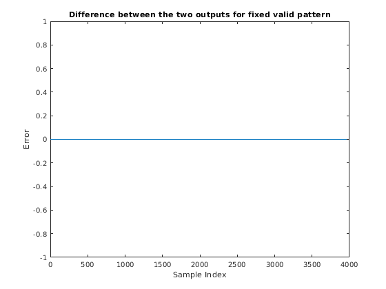 dataOut1 = out1(:); dataOut2 = out2(:); figure; plot(abs(dataOut1-dataOut2)); title('Difference between the two outputs for fixed valid pattern') xlabel('Sample Index'); ylabel('Error'); bdclose(modelname);