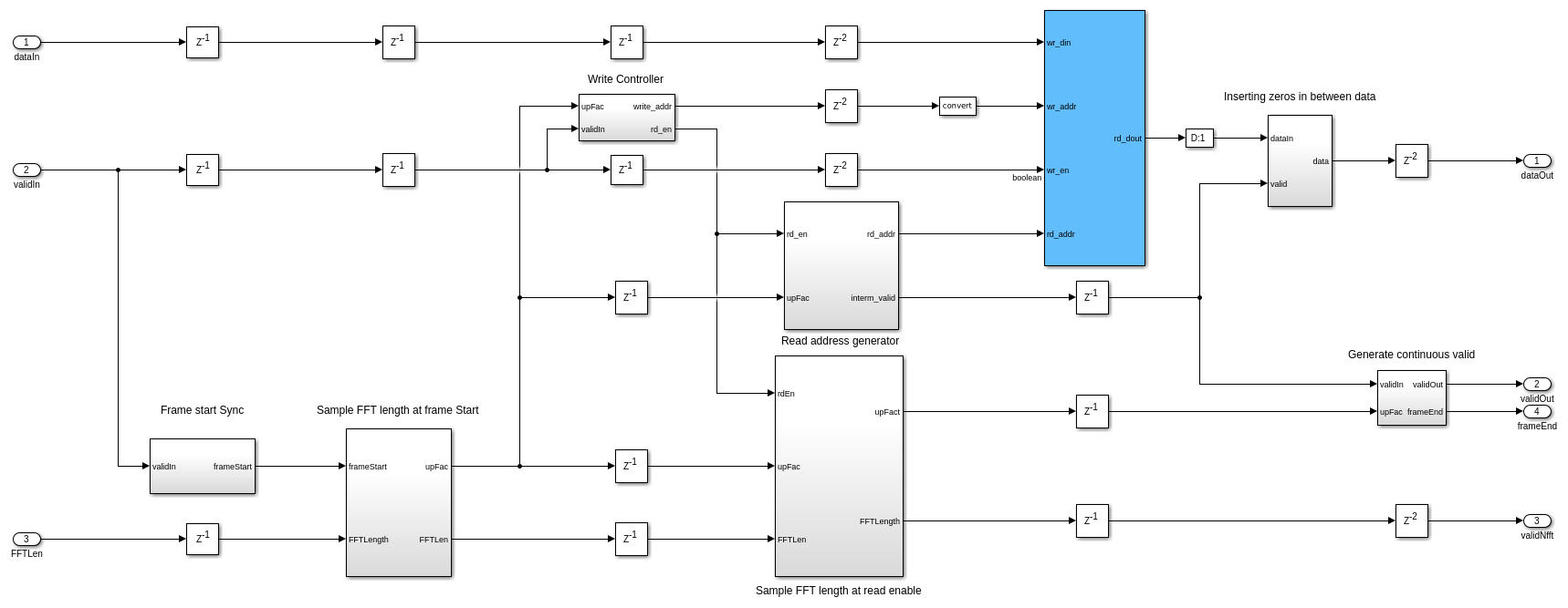 В таком сценарии проект должен сохранить входные выборки в RAM и заполнить недопустимые выборки между допустимыми выборками перед пересылкой его к БПФ. Модель VariableSizeFFTArbitraryValidPatternHDLExample может обработать любой произвольный шаблон допустимого входа, пока разрыв между кадрами является, по крайней мере, одной длиной БПФ (2 048 выборок для LTE). Эта модель совпадает с моделью VariableSizeFFTHDLExample, за исключением подсистемы контроллера данных. Подсистема контроллера данных в модели использует RAM размера 2*fftLenSinFFT (как показано в фигуре ниже), чтобы сохранить входные выборки, считывает допустимые выборки при дополнении нулей между ними и затем передаче их БПФ. В то время как входные данные пишутся в одну половину памяти, данные считаны из другой половины памяти. В результате общая задержка увеличена fftLenSinFFT.