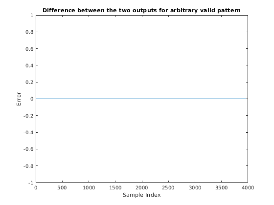 dataOut1 = out1(:); dataOut2 = out2(:); figure; plot(abs(dataOut1-dataOut2)); title('Difference between the two outputs for arbitrary valid pattern') xlabel('Sample Index'); ylabel('Error'); bdclose(modelname);