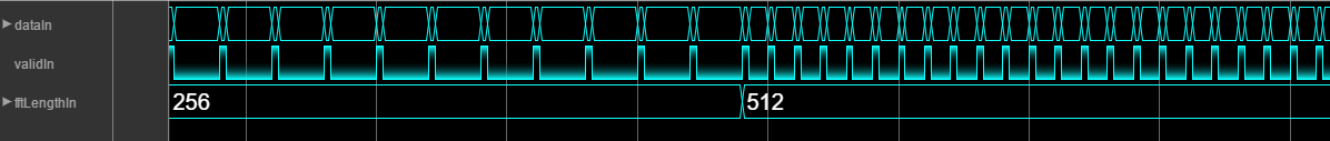 Модель VariableSizeFFTHDLExample требует, чтобы вход допустимый шаблон имел разрыв между допустимыми выборками как показано в фигуре ниже.