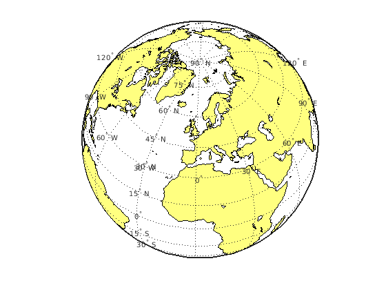 load coastlines originLat = dm2degrees([48 48]); originLon = dm2degrees([ 2 20]); figure('Color','w') axesm('ortho','Origin',[originLat originLon]) axis off; framem on; gridm on; mlabel on; plabel on; setm(gca,'MLabelParallel',30,'PLabelMeridian',-30) geoshow(coastlat,coastlon,'DisplayType','polygon')