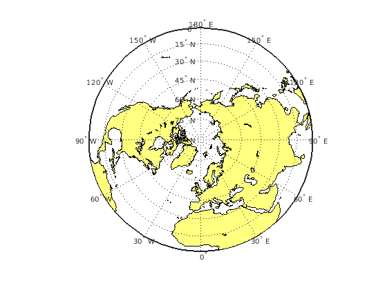 load coastlinesСоздайте карту. Вызов axesm эквивалентен: axesm('eqaazim','MLabelParallel',0,'Origin',[90 0 0],'FLatLimit',[-Inf 90]);