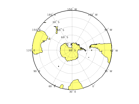 load coastlines figure('Color','w') axesm('stereo','Origin',[-90 -150],'MapLatLimit',[-90 -20]) axis off; framem on; gridm on; mlabel on; plabel on; setm(gca,'MLabelParallel',-20) geoshow(coastlat,coastlon,'DisplayType','polygon')