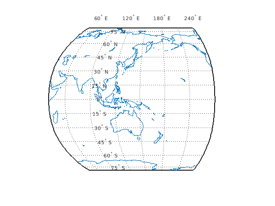 latlim = [-80 80]; lonlim = [100 -120]; figure axesm('robinson','MapLatLimit',latlim,'MapLonLimit',lonlim,... 'Frame','on','Grid','on','MeridianLabel','on','ParallelLabel','on') axis off setm(gca,'MLabelLocation',60) load coastlines plotm(coastlat,coastlon)