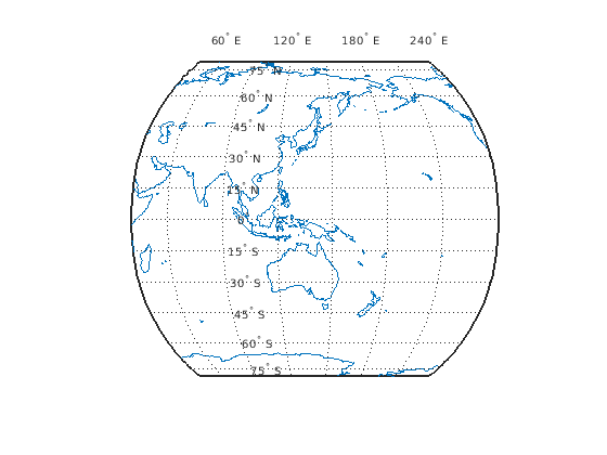 load coastlinesСоздайте Меркаторскую проекцию, покрывающую полный спектр допустимых широт с долготами, покрывающими полные 360 степени, запускающиеся на 60 Западе. Вызов axesm выше эквивалентен: axesm('mercator','Origin',[0 120 0],'FlatLimit',[-90 90],... 'FLonLimit',[-180 180]).