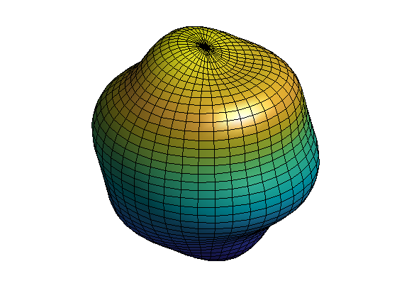 degree = 6; order = 1; amplitude = 0.5; radius = 5; Ymn = legendre(degree,cos(theta(:,1))); Ymn = Ymn(order+1,:)'; yy = Ymn; for kk = 2: size(theta,1) yy = [yy Ymn]; end yy = yy.*cos(order*phi); order = max(max(abs(yy))); rho = radius + amplitude*yy/order; r = rho.*sin(theta); % convert to Cartesian coordinates x = r.*cos(phi); y = r.*sin(phi); z = rho.*cos(theta);