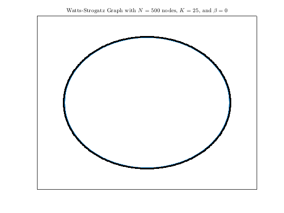 h = WattsStrogatz(500,25,0); plot(h,'NodeColor','k','Layout','circle'); title('Watts-Strogatz Graph with $N = 500$ nodes, $K = 25$, and $\beta = 0$', ... 'Interpreter','latex')