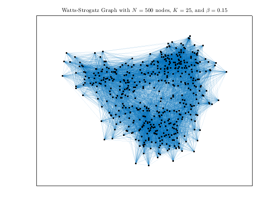 h2 = WattsStrogatz(500,25,0.15); plot(h2,'NodeColor','k','EdgeAlpha',0.1); title('Watts-Strogatz Graph with $N = 500$ nodes, $K = 25$, and $\beta = 0.15$', ... 'Interpreter','latex')