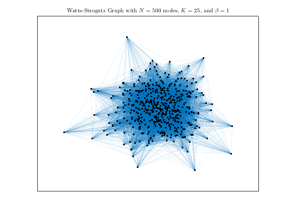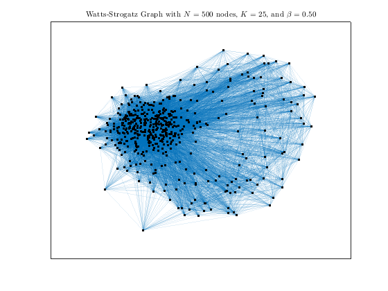 Файл WattsStrogatz.m реализует этот алгоритм графика для неориентированных графов. Входными параметрами является N, K и beta согласно описанию алгоритма выше.